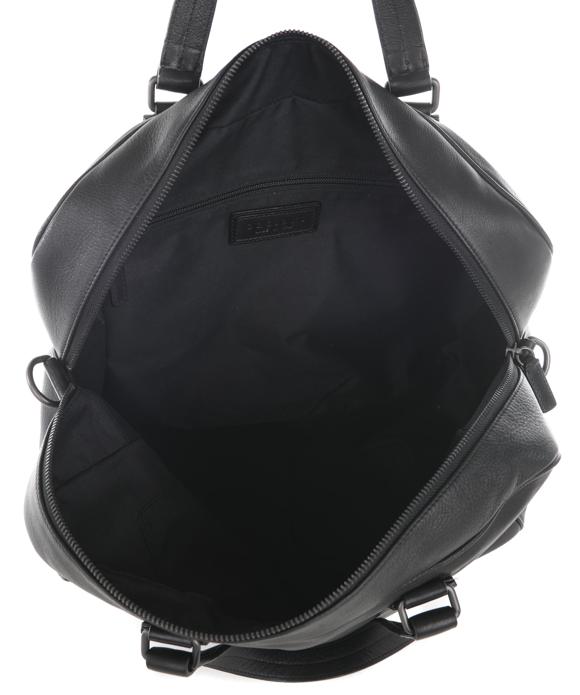 Borsone Orciani in nappa Nera. Due manici morbidi in nappa. Tracolla removibile. Tasca esterna con zip sul retro. Apertura con zip. All'interno tasche applicate e tasca con zip. Foderata. Logo frontale impresso a caldo. Rifiniture in metallo imbrunito.