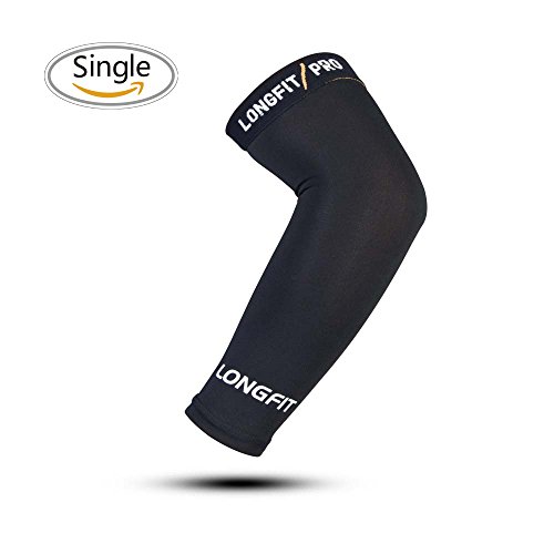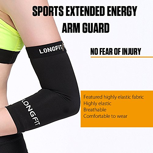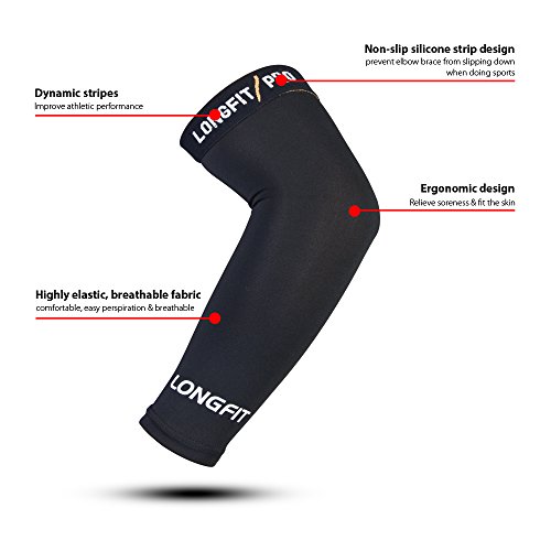 Anti-Slip Silicone Strip--- keeps your elbow sleeve in place and prevents it from sliding down, sleeve is very durable and maintains its shape and elasticity after many washings. The support is simple to slip on and off and features a stylish black design with white Longfit logo.
