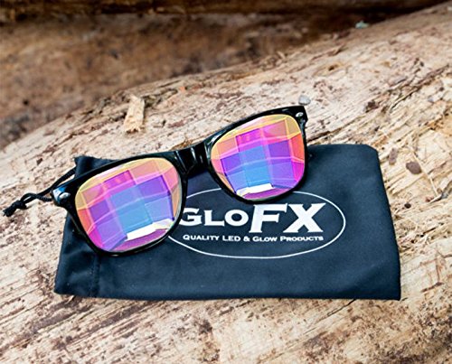 Since the conception of GloFX, our goal has been to innovate and engineer the future of rave eyewear. With our Ultimate Kaleidoscope Glasses, we've created something truly special. For supreme comfort and style we have taken our famous kaleidoscope lenses, and combined them with our classic "Ultimate" frame to provide you a set of Kaleidoscope Glasses unlike anything else on the market. The Bug Eye lens is an all new design available exclusively at GloFX. This lens allows for the light to be split into multiple angles or a traditional image, depending on the angle in which you view them. Never before has their been such a vast variety of imagery from one set of glasses. Our redesigned glass crystals utilize our Rainbow Spectrum Technology (RST), to create a different array of colors at every angle. The Bug Eye crystal allows for more clarity while maintaining an intense kaleidoscopic effect and deep pallet of colors. RST paired with our real glass Bug Eye crystal helps refract light from different directions. We developed our crystals with RST to provide the revolution in fractal kaleidoscopic eyewear. For years, Kaleidoscope Glasses have been limited to a perfectly circular lens and frame. We have created a lens that works with our best housing, the Ultimate True-Flex PVC Frame. The user can now see a wider view of rich prismatic colors with our most popular frame style. We've engineered the Ultimate Kaleidoscope Glasses for any fractal glasses connoisseur. Each pair of Ultimate Kaleidoscope Glasses is hand assembled in the USA with superior craftsmanship. These unique rainbow fractal glasses are exclusively designed and manufactured by GloFX.Feature