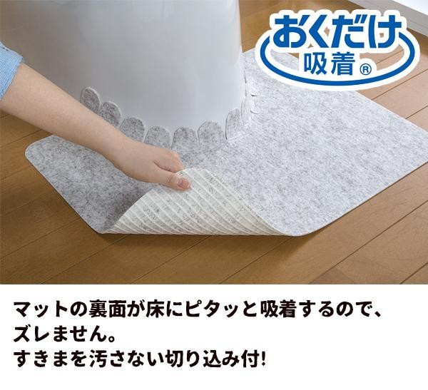 水や汚れをはじく、お手入れ簡単な大理石調トイレマットです♪すきまを汚さない切り込み付!!サイズに合わせてハサミやカッターでカットすることができます。マットの裏面が床にピタッと吸着するので、ズレません。カテキン入りで、アンモニア臭の消臭効果があります。生地が薄いのでつまずきにくく、扉の開閉の妨げにもなりません。 |