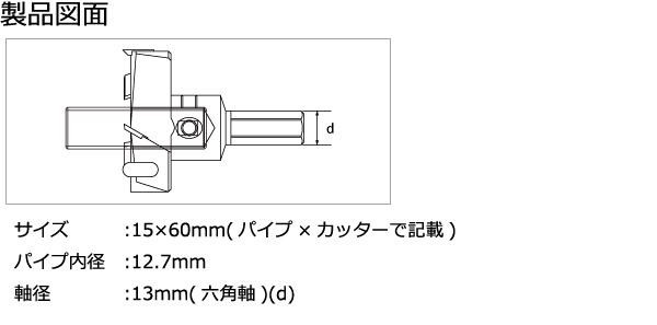 | サイズ | サイズ:15×60mm(パイプ×カッターで記載)、パイプ内径:12.7mm、軸径:13mm(六角軸)(d) 個装サイズ:7×15×6cm |