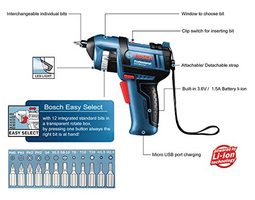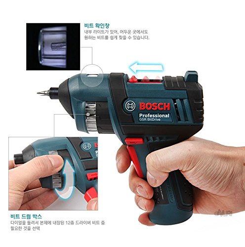 -. Binding : Misc. -. Brand : Bosch -. Color : Green -. EAN : 8806524005826 -. Feature : Innovative BOSCH 12 bits Easy Select / USB Rechargable Battery Type (Full charging time: 4 hours)- You can use in you car and home / Compact and Light weight / LED light, Strap, Carrying Bag Included -. Label : BOSCH -. Manufacturer : BOSCH -. Model : GSR BitDrive -. MPN : GSR BitDrive -. PackageQuantity : 1 -. PartNumber : GSR BitDrive -. ProductGroup : Home Improvement -. ProductTypeName : TOOLS -. Publisher : BOSCH -. Size : Small -. Studio : BOSCH -. Title : BOSCH GSR BitDrive Professional "Built in 12 BITs" Cordless USB Recharrgable Electric Screwdriver 3.6V