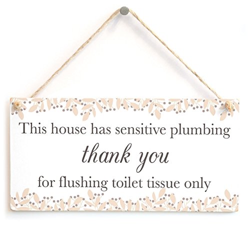 Wooden Hanging Sign This house has sensitive plumbing thank you for flushing toilet tissue only - Neutral Colour Septic Tank Notice Hanging Sign For Toilet Door