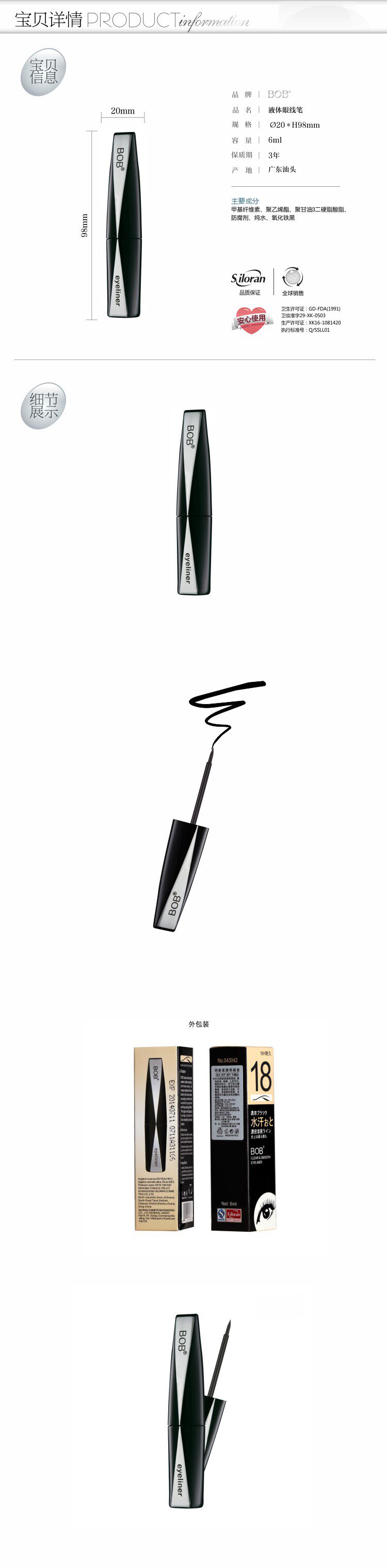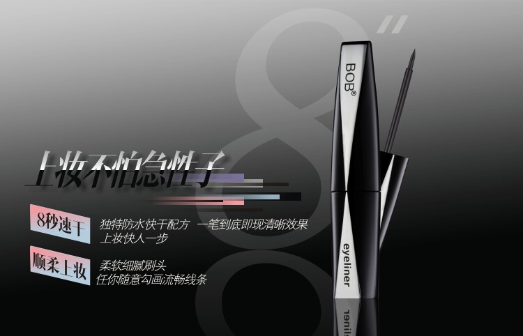 BOB明晰柔顺眼线液,质地柔滑,细腻,上色均匀。独特的防水 快干配方。