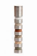 -. Feature : Clear acrylic containers / Interchangeable ceramic grinder / up to 6 spices / space-saving cylinder / Sleek stainless steel design