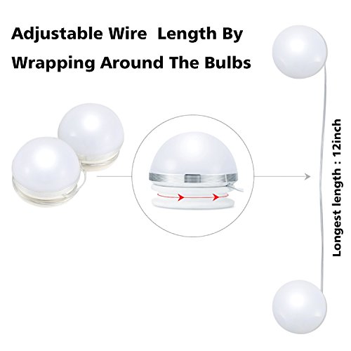- 【ADJUSTABLE LENGTH & ADHESIVE 3M DOUBLE-SIDED TAPE NEVER FALLING OFF】 You can adjust the length of light set for your needs freely. The extra wires can be wrapped and hidden around the base. DON'T have to cut off the extra bulbs at all. The total length of the light kit is 11.5ft, wires are long enough to fit all shapes and sizes. The longest length between 2 bulbs is 13 inch (33cm), you can tuck the wires under the LED bulbs to fit your mirror and keep your vanity makeup set neat and clean.