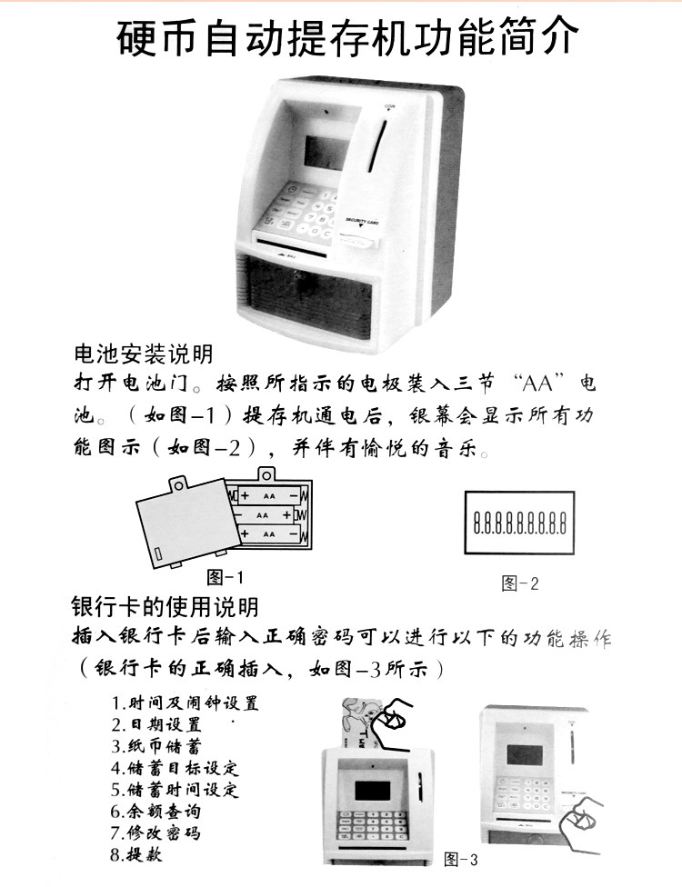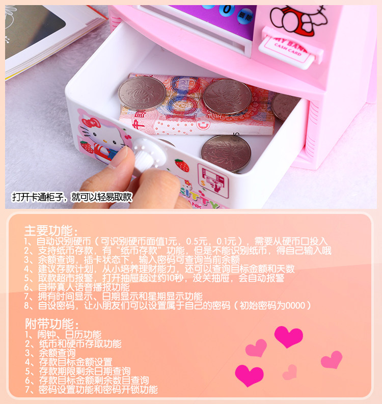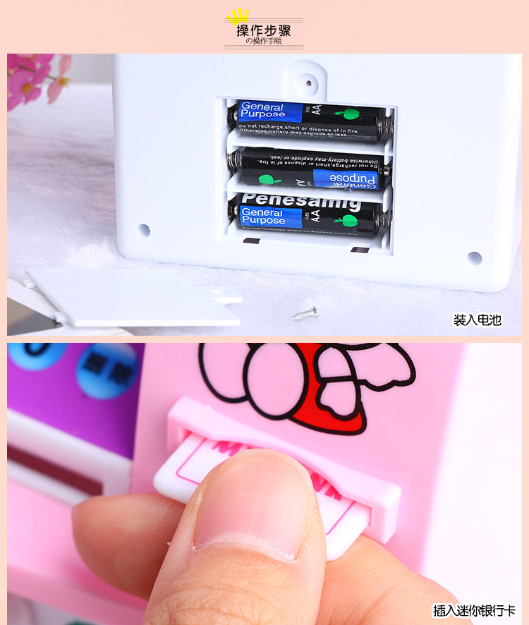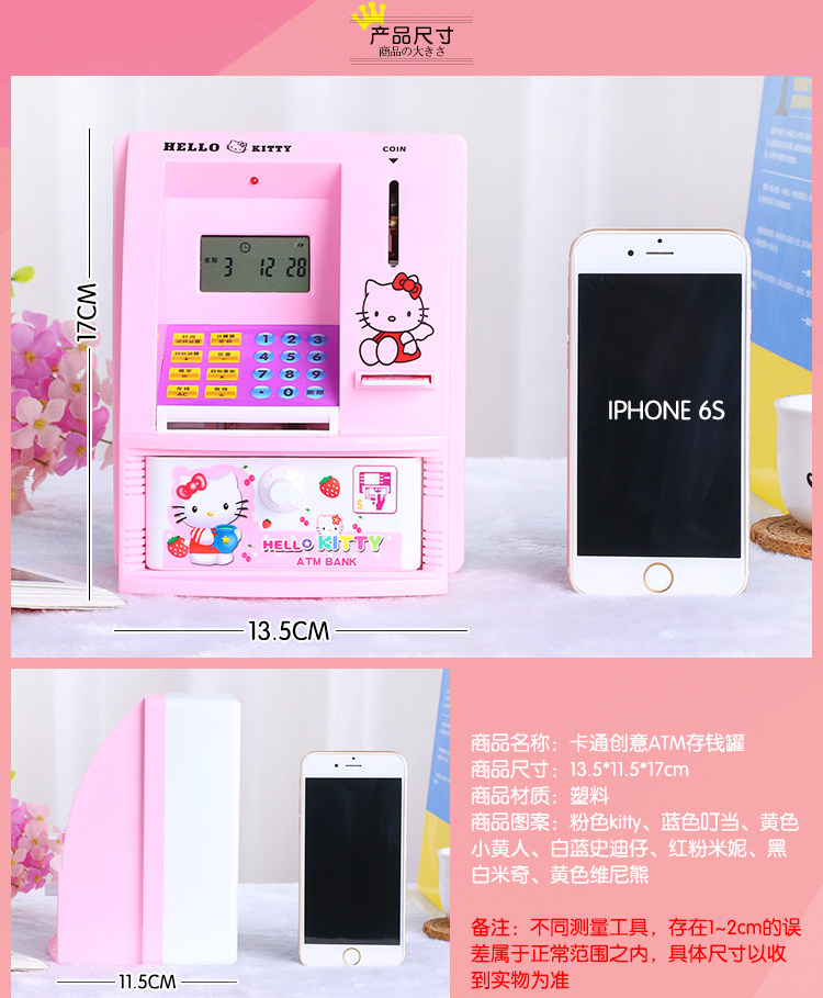拍 下即送小螺丝刀,电池还有精美贴纸哦,岁月的童话ATM存钱罐,依靠的是高品质的产品,高品质的服务,本款产品功能强大,是一款不可多得的智能存钱罐。大 人儿童皆适用:可以开发小孩子的学习能力和理财观念;大人使用,放松心情,舒缓压力。同时赠送的螺丝刀和电池,卡通贴纸。购买前,请务必看产品描述。