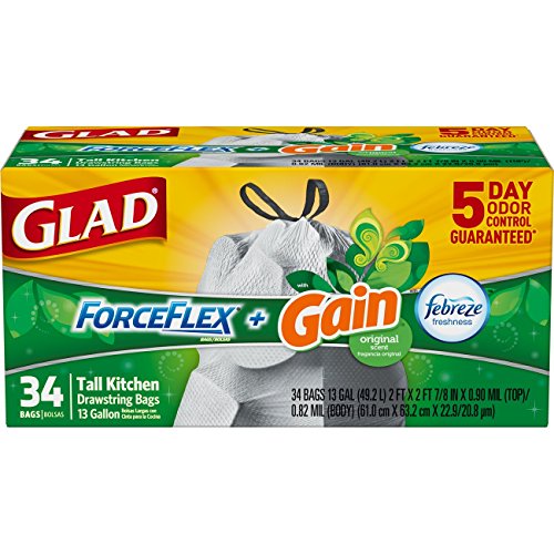 Glad ForceFlex OdorShield Tall Kitchen Drawstring Trash Bags - Gain Original and Febreze Freshness - 13 Gallon - 34 Count