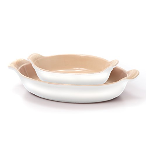 Studio : Le Creuset Publisher : Le Creuset Product Description Treat yourself to something delicious with this two piece set of Le Creuset au gratin dishes. These incredibly versatile cast stoneware pieces are perfect for all of your needs, from baking to serving and even storing. Each cookware piece is fired at 2156 degrees Fahrenheit, making them virtually nonporous so they don't absorb flavors, odors, or moisture. The enameled surface also makes them incredibly resistant to scratches, chipping, and staining. The Heritage style flared handles allow for safe maneuvering directly from oven to table. Perfect for individual servings, these unique little dishes offer huge possibilities. Serve up some snacks, appetizers, or your very own creme brulee, and enjoy the easy clean-up when you're through. Suitable for use in the oven up to 500 degrees Fahrenheit, these dishes can be broiled or baked. Backed by a five year manufacturer's warranty, they are also dishwasher safe for easy cleanup. 1.7 quart au gratin -- 8" L x 14" W x 2-1/2" H; 24 ounce au gratin -- 8" L x 5-3/4" W x 1-1/4" H 0