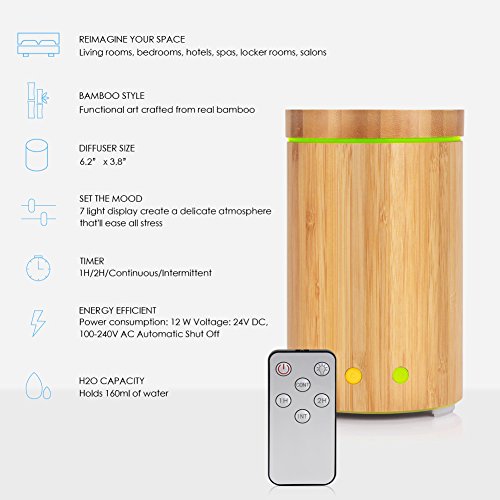-. Brand : Syntus -. EAN : 0610731319618 -. Feature : Classy Look - Syntus 160ml essential oil diffuser is made of real natural bamboo; Blend in well with any decor in your house. / 360°All Round Remote Control - The real bamboo oil diffuser saves hassles of pressing buttons when use each time. / Timer Setting - 1 or 2 hours alternative for time setting; Continuous and intermittent mode are available as well. / Easeful LED Lights Display - The ultrasonic aromatherapy diffuser creates a delicate atmosphere that'll relieve all stress. / Waterless Auto Shut-off - Smart technology for personal safety. -. Label : Syntus -. Manufacturer : Syntus -. Model : D160 -. MPN : D160 -. PackageQuantity : 1 -. PartNumber : D160 -. ProductGroup : Kitchen -. ProductTypeName : KITCHEN -. Publisher : Syntus -. Studio : Syntus -. Title : Syntus Essential Oil Diffuser, Real Bamboo Diffuser with Remote Control 160ml Ultrasonic Aromatherapy Diffusers with Colorful Lights, Timer Setting and Waterless Auto Shut-off -. UPC : 610731319618