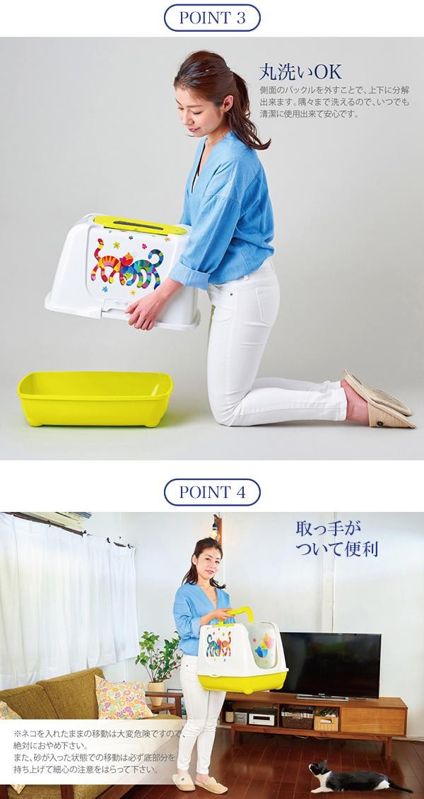 ボディ表面に模様が入ったインテリア性の高いネコトイレです。フード付きで更に扉もついているので、砂やニオイが漏れにくくなっています。側面のバックルを外すことで、上下に分解して丸洗いも出来ます。 |