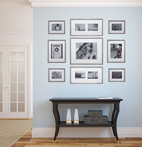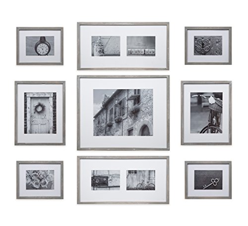 GALLERY PERFECT 9 Piece Greywash Wood Photo Frame Wall Gallery Kit #17FW2317. Includes: Frames, Hanging Wall Template, Decorative Art Prints and Hanging Hardware