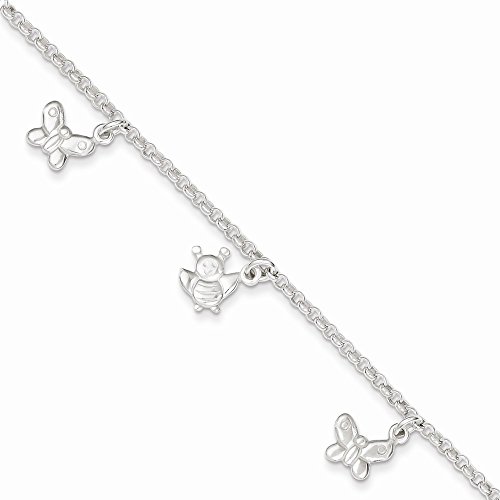 -. Title : Sterling Silver Polished Butterflies & Bumble Bee Anklet