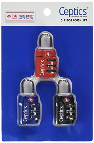 Ceptics 3 Pack Luggage Locks TSA Approved Travel Security Combination Padlocks - Black, Red, Blue