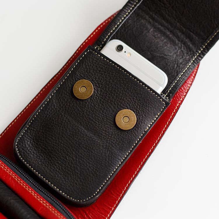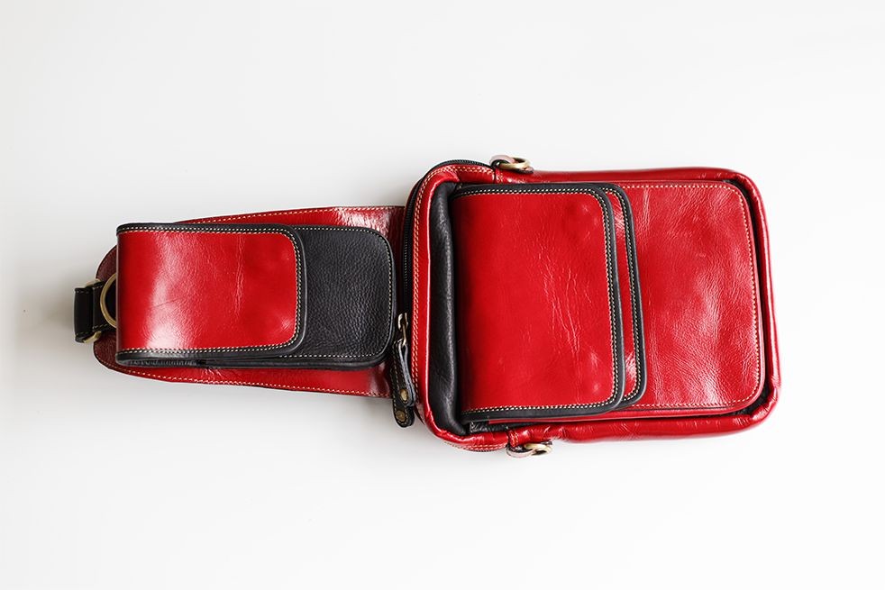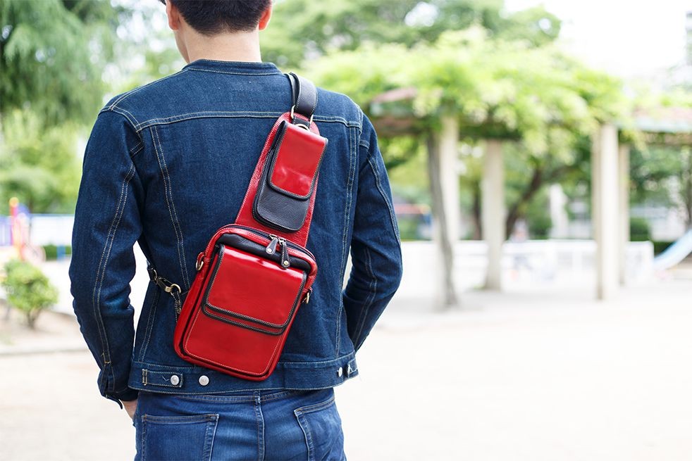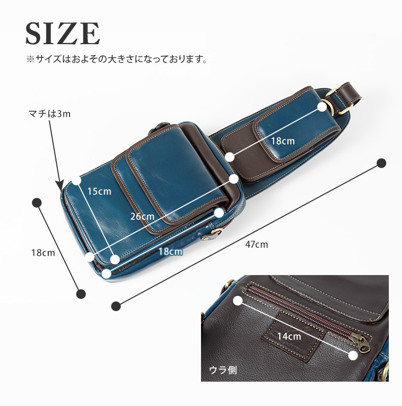 独特の艶と輝きを放つイタリアンレザーは、非常に味わい深い素材感!スタイルはシンプルなダブルフラップデザイン、使い込むほどに渋味が出て末長く愛用出来ます。前面にフラップポケット、メインポケット上部にはスマートフォン等の収納ポケットが有ります。収納力と機能性に優れたボディバッグです。ショルダーベルトは長さ調整は可能、アタッチメントで左右お好みのほうに取り付け可能です。普段持ち歩く財布、スマートフォン、車のキーや手帳等の小物を収納してスタイリッシュに持ち運びできます。シンプルマインドに可愛さと大人の高級感を表現しており、使い込むほどに深まるレザーの味わいを楽しめます。【サイズ】縦47.0cm × 横18.0cm × マチ3.0cm(本体)縦18.0cm × 横15.0cm × マチ1.5cm(フラップポケット)横17.0cm(ファスナー付きフラップポケット)縦18.0cm(内寸12.0cm) × 横9.0cm × マチ1.5cm(スマホポケット)長さ100.0cm × 幅3.0cm(ショルダーベルト フック含む)【素材】牛革 イタリアンレザー(本体)合金(金具)【カラー】レッド、ブルー