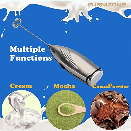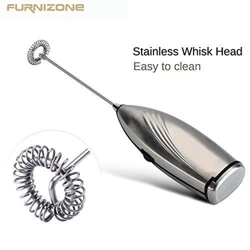 Studio : Furnizone Publisher : Furnizone Product Description Forget expensive espresso machines and clumsy pump action frothers, this awesome milk froth without the hassle of a big and bulky machine. The FURNIZONE milk frother is designed with a soft metallic casing and fits in one hand comfortably. At a click of a button this powerful little tool froths milk at 15000 rpm(revolutions per minute). But don't stop there, the little whipper can also be used for making whipped cream, milkshakes, omelettes and many other food preparation tasks. Due to its size this milk frother comes with a free stand to mount inside a cupboard, easily stored. The frothing disk is Stainless Steel ensuring durability.
