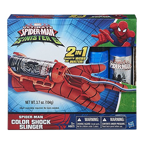 -. Feature : Shoots water or Spidey Shot Web Fluid / Imagine web-slinging Spidey battles / Glove is one size fits most and features Spider-Man design / Includes Color Shock Slinger, Spidey Shot Web Fluid, refillable water cartridge, and glove.