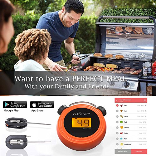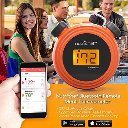 NutriChef Smart Bluetooth BBQ Grill Thermometer w/ Digital Display - Stainless Dual Probes Safe to Leave in Outdoor Barbecue Meat Smoker - Wireless Remote Alert iOS Android Phone WiFi App - PWIRBBQ60