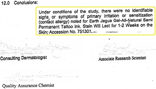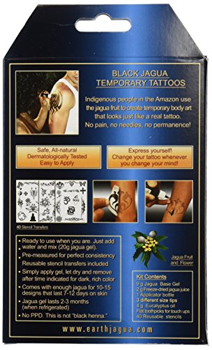-. Feature : Made in the USA - NOT India or China (like other kits) - Every batch was recently hand-picked and tested for freshness and safety. / All Natural, Organic, and Lasting - Safe for children, this kit does not contain PPD or any other toxic chemicals. The Jagua fruit is farmed organically. This is NOT henna or "black" henna. Tattoo will last anywhere between 10 to 15 days / Shelf Life - The only kit on the market, which offers Jagua that is ready to use when you are, whether that's one day or two years from the time of purchase! Just add water and mix to create Jagua gel that lasts 2-3 months, when refrigerated. / Pre-measured - Perfect consistency every time. Reusable stencil transfers included. Enough jagua for approximately 15 designs! / No trees are ever cut down to create this product and a portion of the sales are donated to the Matsés community for healthcare needs.