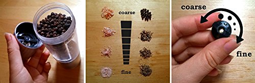 COARSE OR FINE – IT'S YOUR CHOICE: 2-in-1 Adjustable Ceramic Sea Salt Grinder & Pepper Grinder Set, you can easily adjust the grinding setting by simply twisting the knob on the ends of the mill. Easily adjusts from fine to coarse grind