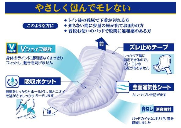 | 素材・材質 | 表面材:ポリプロピレン不織布 吸水材:綿状パルプ/高分子吸収材 防水材:ポリエチレンフィルム 止着材:ホットメルト 伸縮材:ポリウレタン糸 結合材:ホットメルト粘着材 |
