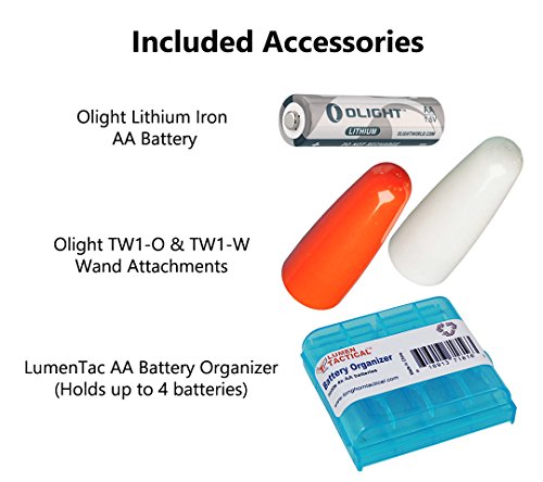 Comes with a lithium iron AA battery, a LumenTac AA battery organizer capable of carrying up to 4 batteries and Olight's TW1-O and TW1-W attachments to instantly turn your light into a traffic wand or lantern