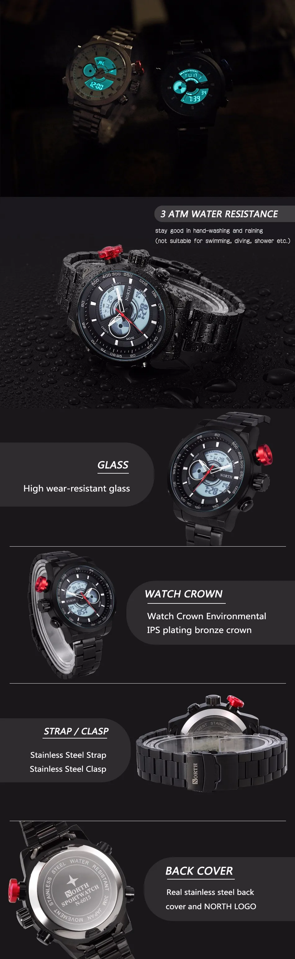 Feature:Complete Calendar,Water Resistant,Stop Watch,Back Light,LED display,Swim,Alarm