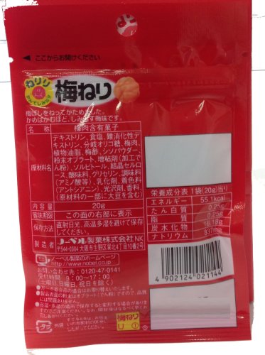 原材料:デキストリン、食塩、難消化性デキストリン、分岐オリゴ糖、梅肉、植物油脂、梅酢、シソパウダー、粉末オブラート、増粘剤(加工でん粉)、ソルビトール、結晶セルロース、酸味料、グリセリン、調味料(アミノ酸等)、乳化剤、着色料(アントシアニン)、光沢剤、香料、(原材料の一部に大豆を含む)