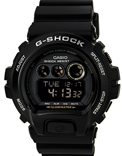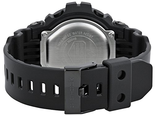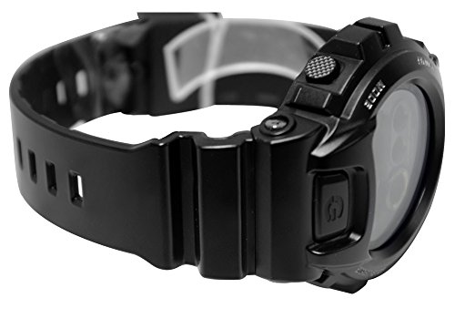 A digital G-Shock watch in a shock-resistant, monochrome shell. LED illumination and 5 daily alarms. World time with 35 city-designated time zones. Stopwatch and countdown features.