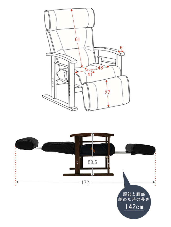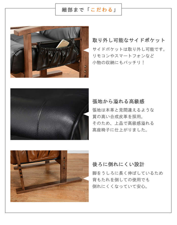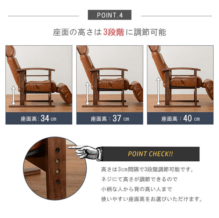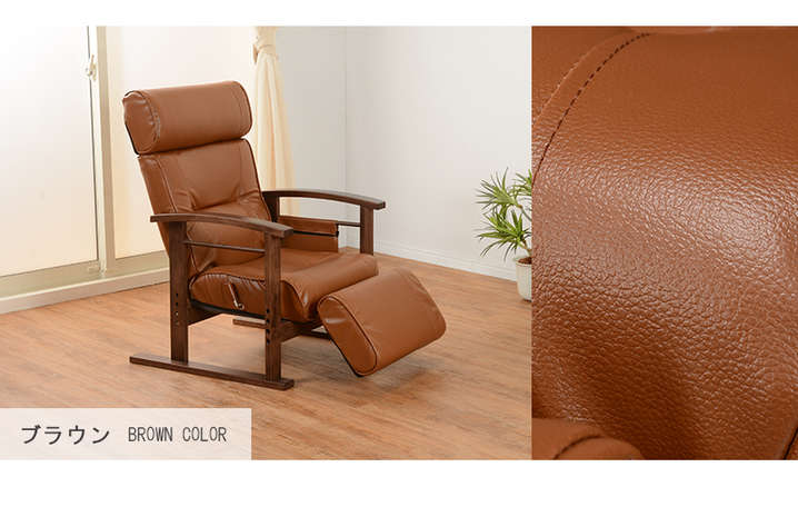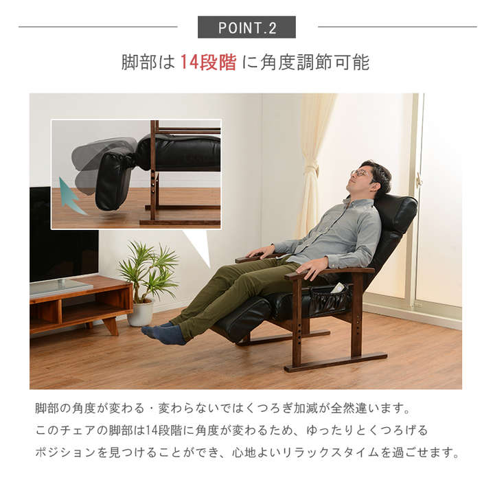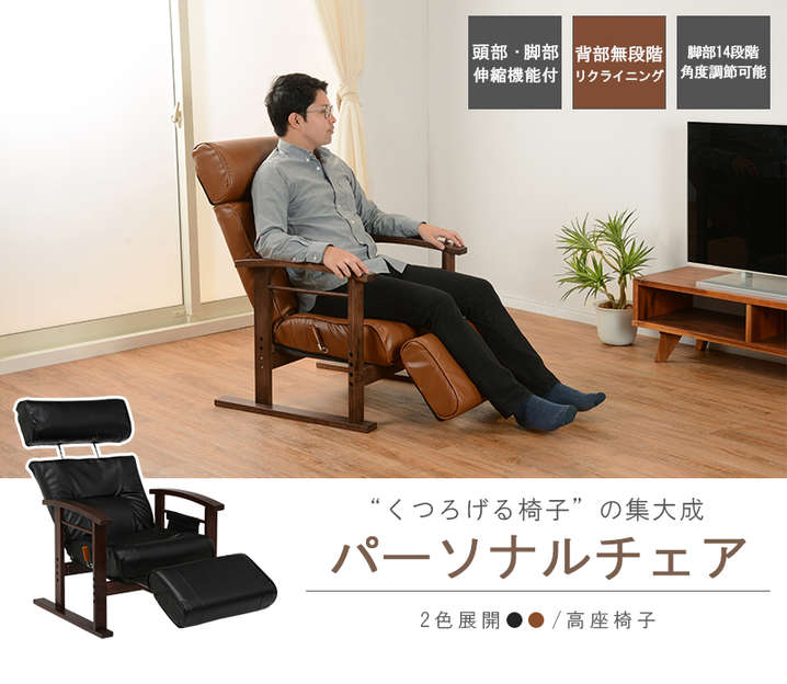 ●頭部、脚乗せ部が伸縮する極上の座りが体験できる高座椅子。背もたれは手元レバー無段階リクライニング、脚部は14段階リクライニング。