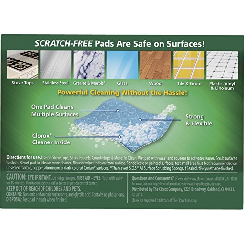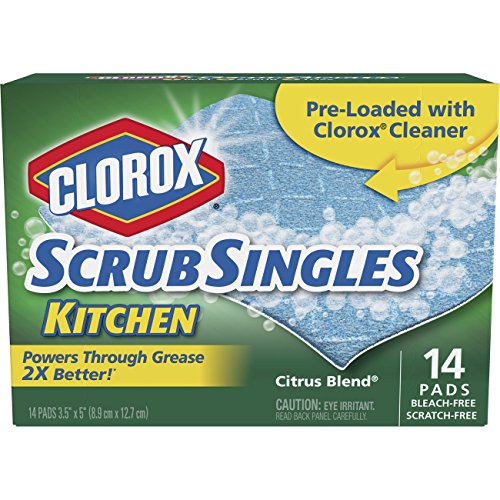 -. Feature : 14 count box of disposable scrubbing pads preloaded with Clorox cleaner / Strong and flexible scrubber pads clean multiple surfaces / Bleach-free pads cut through kitchen grease and grime / Contains powerful kitchen cleaner in Citrus Blend scent / Simply wet, scrub and toss for easy kitchen cleaning
