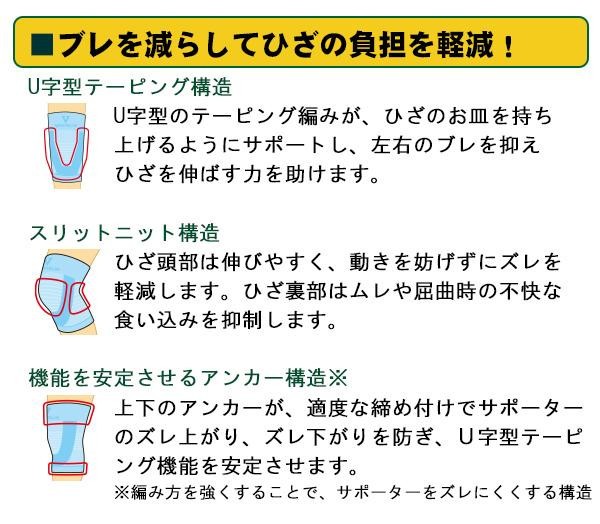 高通気構造採用のテーピング機能付サポーター。着用時の不快なムレを押さえながら、関節を快適にサポートします。階段の上り下りもラクに!!