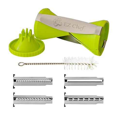 BEST VALUE: Your bundle includes the EZ Chef Spiral Veggie Slicer, 4 interchangeable blades, a vegetable peeler, a deep over-sized safety cap, a cleaning brush, a blade removal tool, easy to use instructions on the box, world class EZ Chef customer service, and a 100% Money Back Guarantee.