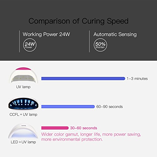 How to use our nail lamp 1. According to its use manual, a thin layer of gel polishing agent on the clean, dry nails, without touching the cuticle or skin next to the nails. 2. Use appropriate timers (30 's/60 's) according to your gel polish's requirements. The lights will be turned off automatically after the specified time. Or use Auto-sensor, it will automatically turn on or off when you put your hands/feet in or out. 3. Please note that the curing time due to gel polishing brand and different. Our nail dryers are polished for a variety of gels, not regular nail polish. Make sure your Polish is compatible before you buy it. To get the best results, don't move your hands too much until the cure is complete. 4. If the gel is polished with a little sticky, please wipe your nails with a gentle cleanser, or rub alcohol to remove leftover sticky residue. Enjoy your beautiful nails or pedicure with our nail dryer! Specifications: Size: 8.26*4.7*3.14inch Plug Type: US Plug Maximum Power Consumption: 24W Wave Length: 365nm 405nm Service Life: 50000h Package Include: 1 * Nail Lamp 1 * Plug 1 * User Manual 0 |