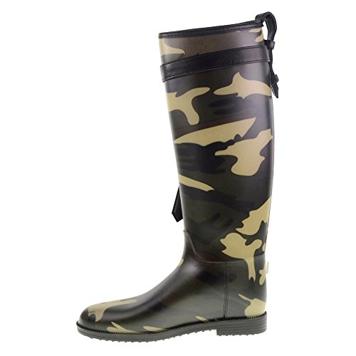 -. Feature : Tall knee-high rain boot with knotted buckle strap at top of shaft / Zigzag-tread outsole