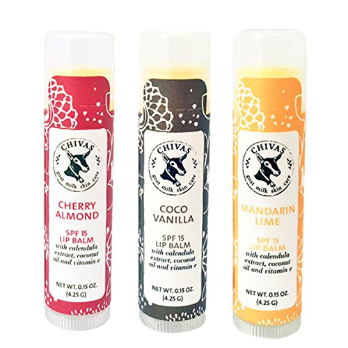 Three Chivas Goat Milk Skin Care .15-ounce SPF 15 Lip Balms in "Cherry Almond", "Coco Vanilla" and "Mandarin Lime" moisturizing formulas.