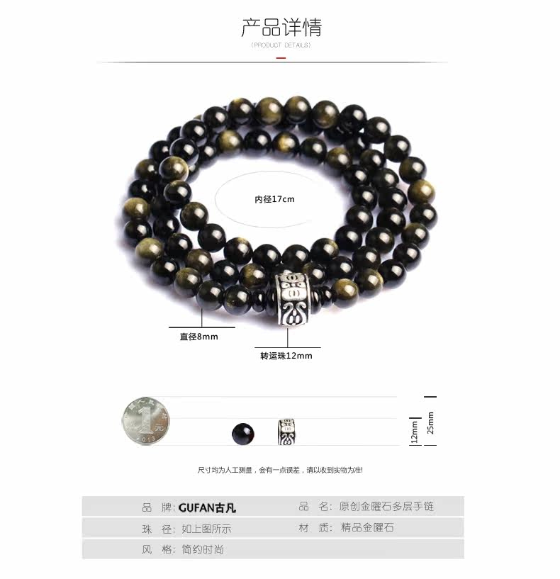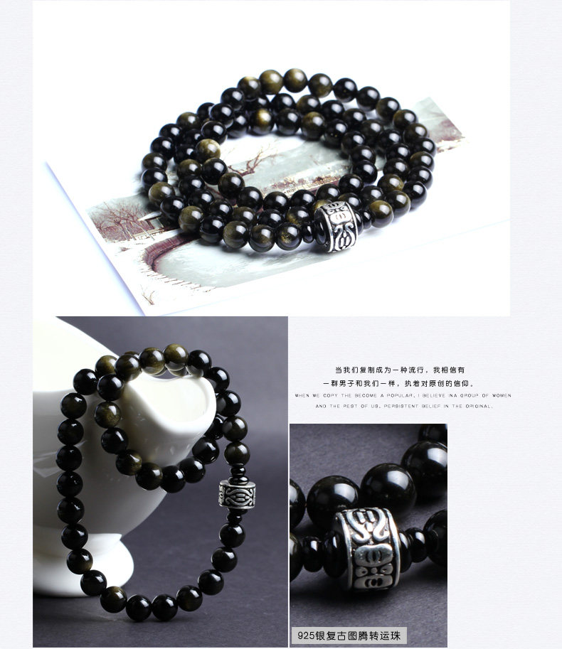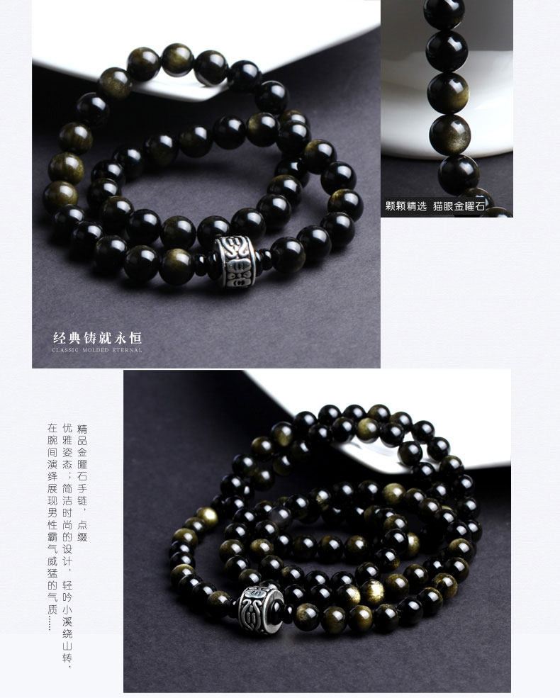 黑曜石手链男士天然双猫眼金曜石佛珠手串女韩版水晶饰品潮