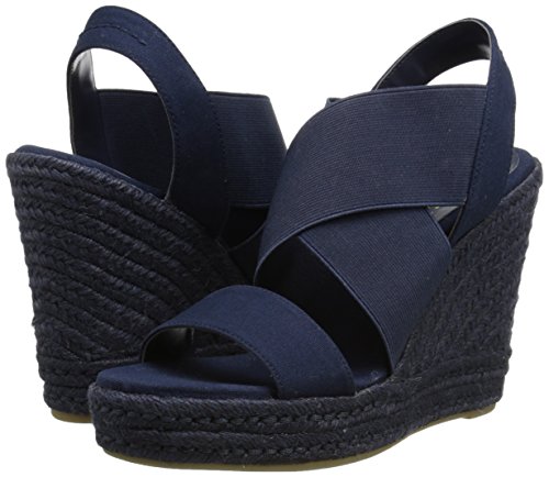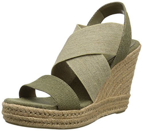 Espadrille-inspired sandal featuring jute-wrapped platform wedge and elasticized crisscross vamp straps