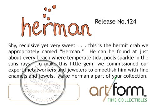 -. Binding : Misc. -. Brand : Objet d' Art -. EAN : 0845277001271 -. Feature : Made 100% by hand by expert metal handicrafters. / Beautifully boxed and includes certificate of authenticity, presentation gift card with matching envelope. / A beautiful, tasteful collectible. A gift worth giving and keeping for a lifetime. / Hand applied authentic Austrian crystal and European lacquers. / Part of the huge collection of jeweled trinket boxes from Artform Fine Collectibles. -. IsAdultProduct : 0 -. ItemPartNumber : THAF09102 -. Label : Artform, LLC -. Manufacturer : Artform, LLC -. Model : THAF09102 -. MPN : THAF09102 -. PackageQuantity : 1 -. PartNumber : THAF09102 -. ProductGroup : Home -. ProductTypeName : HOME -. Publisher : Artform, LLC -. Studio : Artform, LLC -. Title : Objet D'Art Release #124 "Herman" Tidal Hermit Crab Handmade Jeweled Enameled Metal Trinket Box -. UPC : 845277001271 -. Warranty : 90 day warranty against manufacturer defects