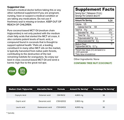 100% pure premium MCT oil with lauric acid, harvested from coconuts. Onnit MCT Oil is sustainably sourced and contains no palm oil, the leading constituent in most MCT oils. Free of fillers, additives, and flavoring.