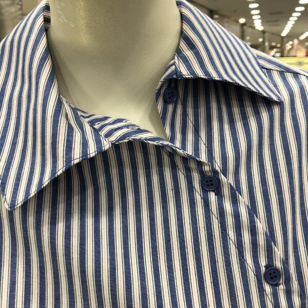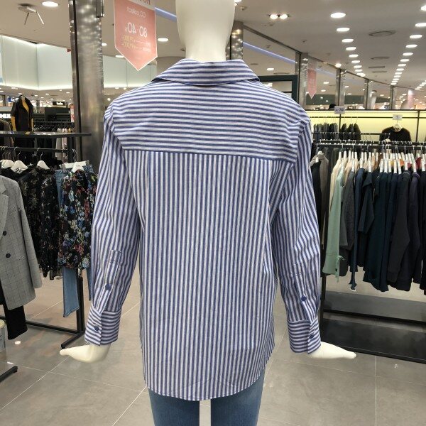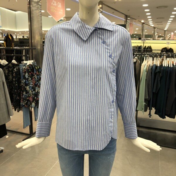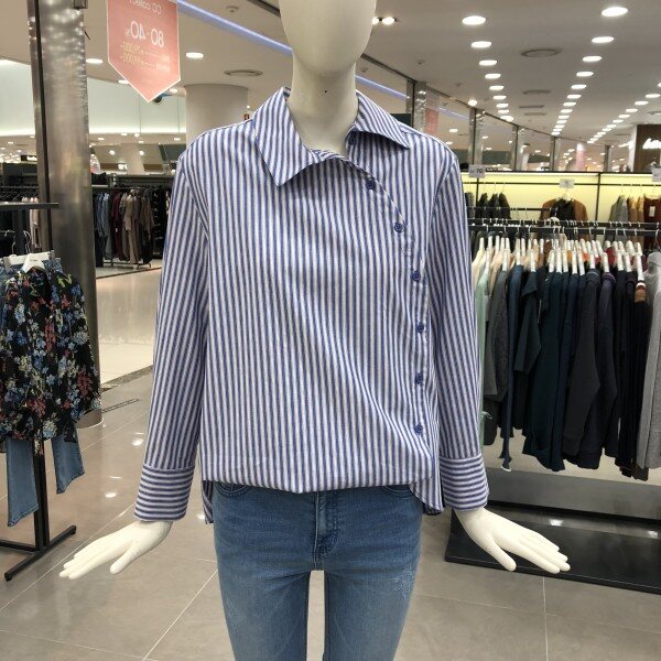 스트라이프셔츠예요,카라밑 사선여밈 단추로 되어있는것이 특징이에요.