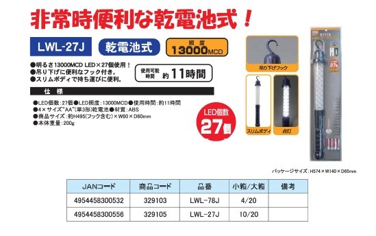 暗所での一般作業や製造ライン・整備作業・キャンプなどに。 明るさ13000MCD LEDx78個使用! 吊り下げに便利なフック付き。スイッチの切り替えで頭部分が点灯、スポット照射できます。 便利なマグネット付きなので作業環境に応じてライトを固定できます。スリムボディで持ち運びに便利。 シガーソケットからの充電も可能。(12V専用) 水素バッテリーを採用しており、継ぎ足し充電ができます。