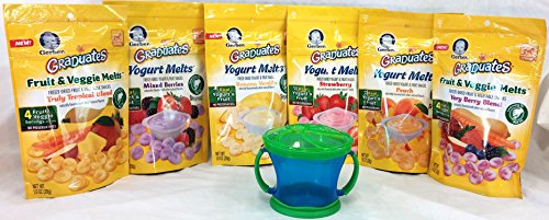 -. Feature : Gerber Graduates Melts Variety Pack of 6 Different Flavors and 1 Snack Catcher Cup. Give your child a healthy snack food they will enjoy to eat. Gerber is the number one trusted source for baby food in the USA. / The Gerber Snack Catcher is perfect for Crawlers and Toddlers Their little fingers can pick up yogurt melts and self feed. Terrific for motor skills development exercise. The Snack Catcher Cup has soft flexible flaps that allow little hands in and keeps snacks from spilling out. Cap twists on so toddlers can't open. Lid easily attaches to top for mess-free travel and snaps onto bottom to create an easy-to-hold handle. Keeps your floors clean when baby is walking about with their snack cup in h / Flavors Include: Strawberry, Peach, Banana Vanilla, Very Berry, Tropical, Mixed Berries. / Made with real yogurt and fruit that are easy-to-chew. No-mess bites are perfect for little hands and are a good source of Vitamins A, C and E per serving. They also have live and active cultures similar to refrigerated yogurt No preservatives, artificial sweeteners or artificial flavors / Also included are 3 disposable bibs and 5 On-The-Go travel wipes for those times when soap and water are not available. Exclusively from Narrow Path Sales