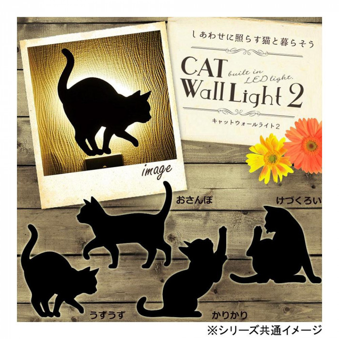 音と振動で光るLEDを使用した、壁面に取り付けるウォールライトです。電池式なので場所を選ばず設置していただけます。暖かみのあるLEDの光が壁に反射し、ネコのシルエットがふんわり浮かび上がります。帰宅時玄関でスイッチを探したり、暗い廊下を歩いてトイレに行く時などに 手元や足元をほんのり明るく照らしてくれます。昼間はインテリアとして、夜はちょっとした間接照明としてご使用いただけます。 |