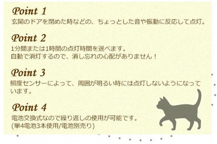 | 仕様 | ●使用電源:単4電池×3本(別売り) ●電池寿命目安:約2000回点灯(1分間点灯、アルカリ電池使用時) ※使用状況・環境により異なる。 ●音や振動に反応して点灯(1分または1時間で自動消灯) ●照度センサー機能付 ●取扱説明書(台紙裏記載) |