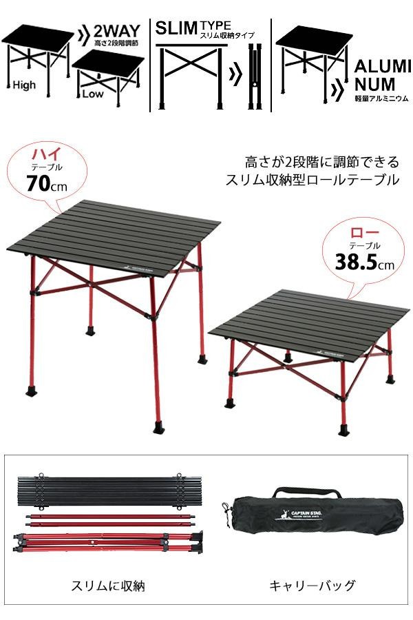 高さが2段階に調節できるスリム収納型ロールテーブル。アルミ天板とアルミ脚を使用しているので軽くて丈夫です。持ち運びに便利なキャリーバッグ付。 |