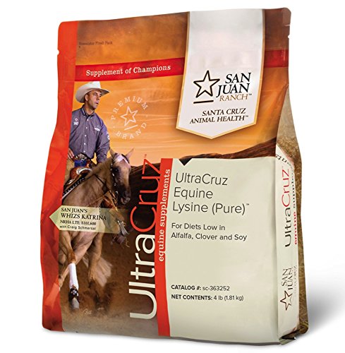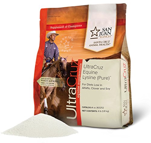 UltraCruz equine lysine (Pure) is a formula that helps to improve the quality and availability of protein in the diet, so it can be utilized more efficiently, and is recommended for equine diets low in alfalfa, Clover and soy. Utilization of protein in the diet is one of the keys to efficient growth, blood building, tissue repair, and Muscle development. This amino acid supplement for Horses provides Pure lysine as an easy to feed, palatable powder.Feature