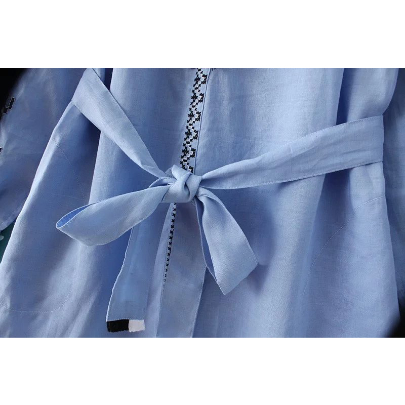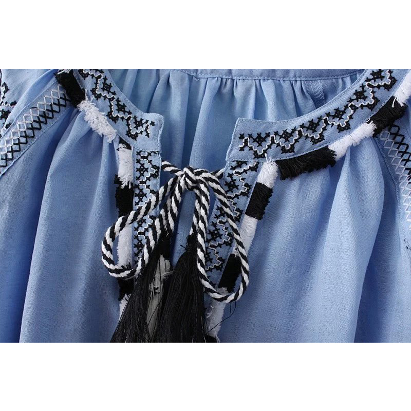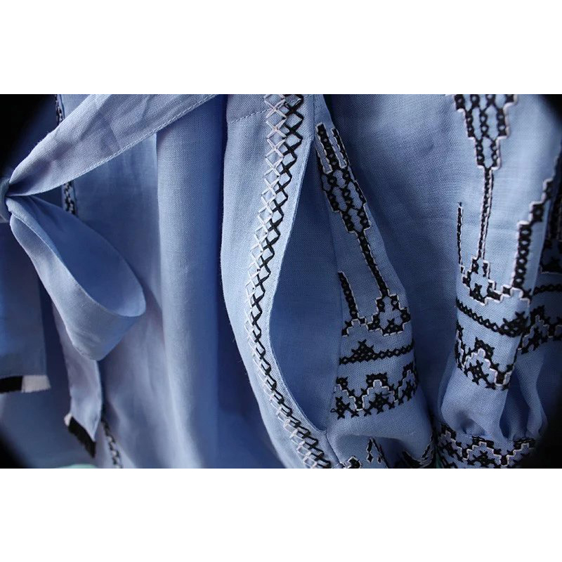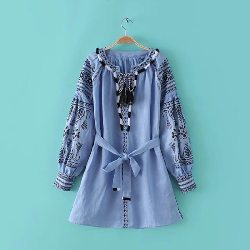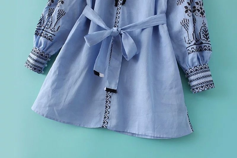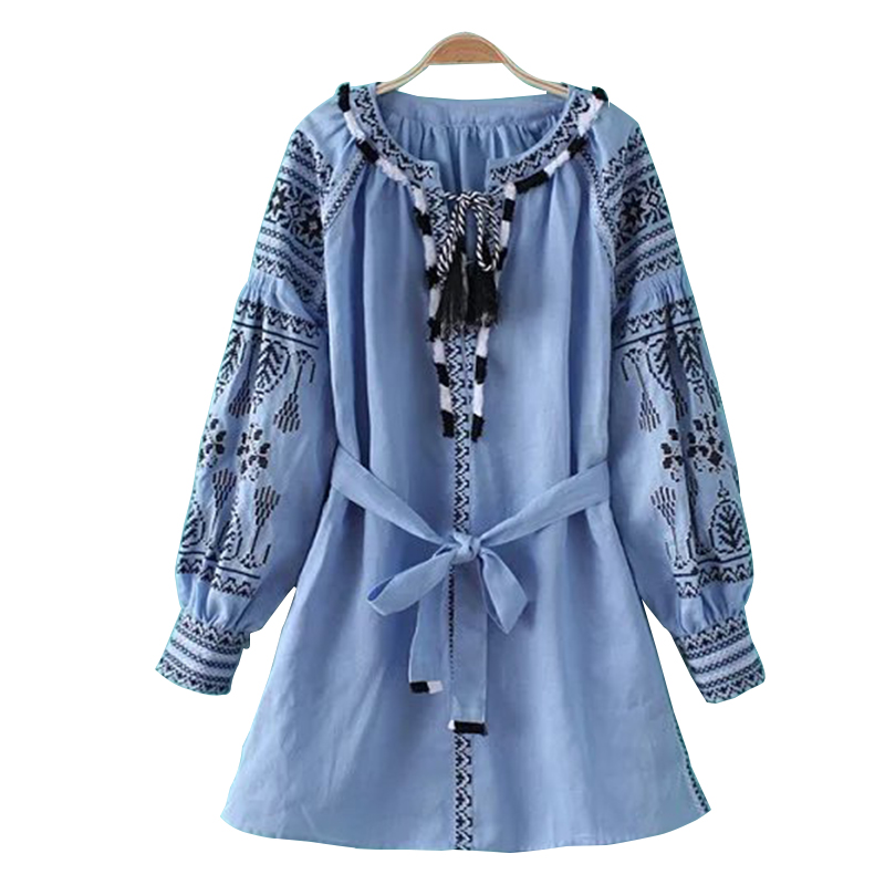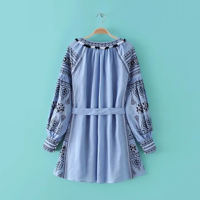 New 2017 Lantern Long Sleeve embroidered Dress robe Courte Women Lace Up Round Neck Blue Short Dress