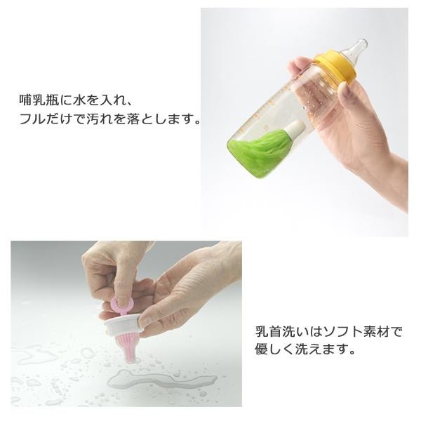 外出時でも少量の水とクリーナーを哺乳瓶に入れて振るだけで、簡単に洗えます。乳首洗いはソフトな素材を使用しているので、優しく洗えます。収納ケース付き。 |