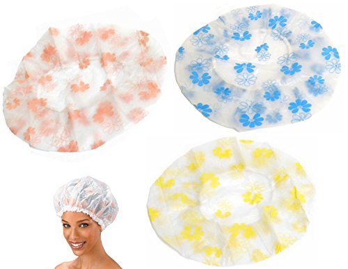 - Set of 3 Large Size (11" Diameter) Shower Cap in Blue , Yellow and Peach Floral Design